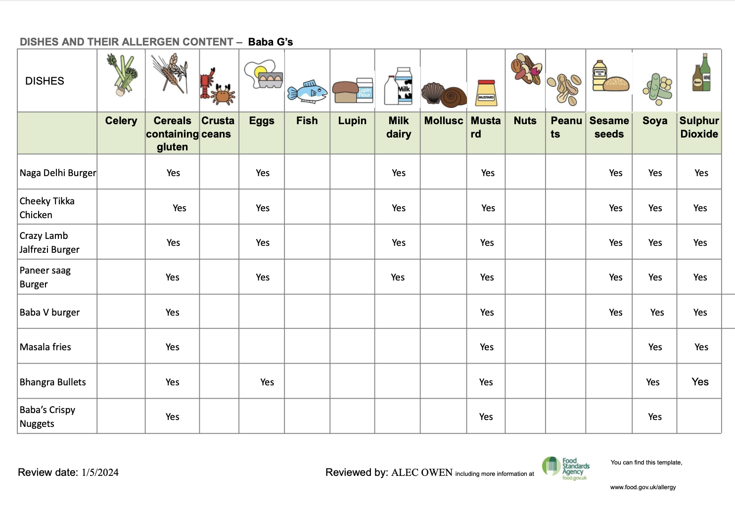 DISHES AND THEIR ALLERGEN CONTENT - Baba G’s