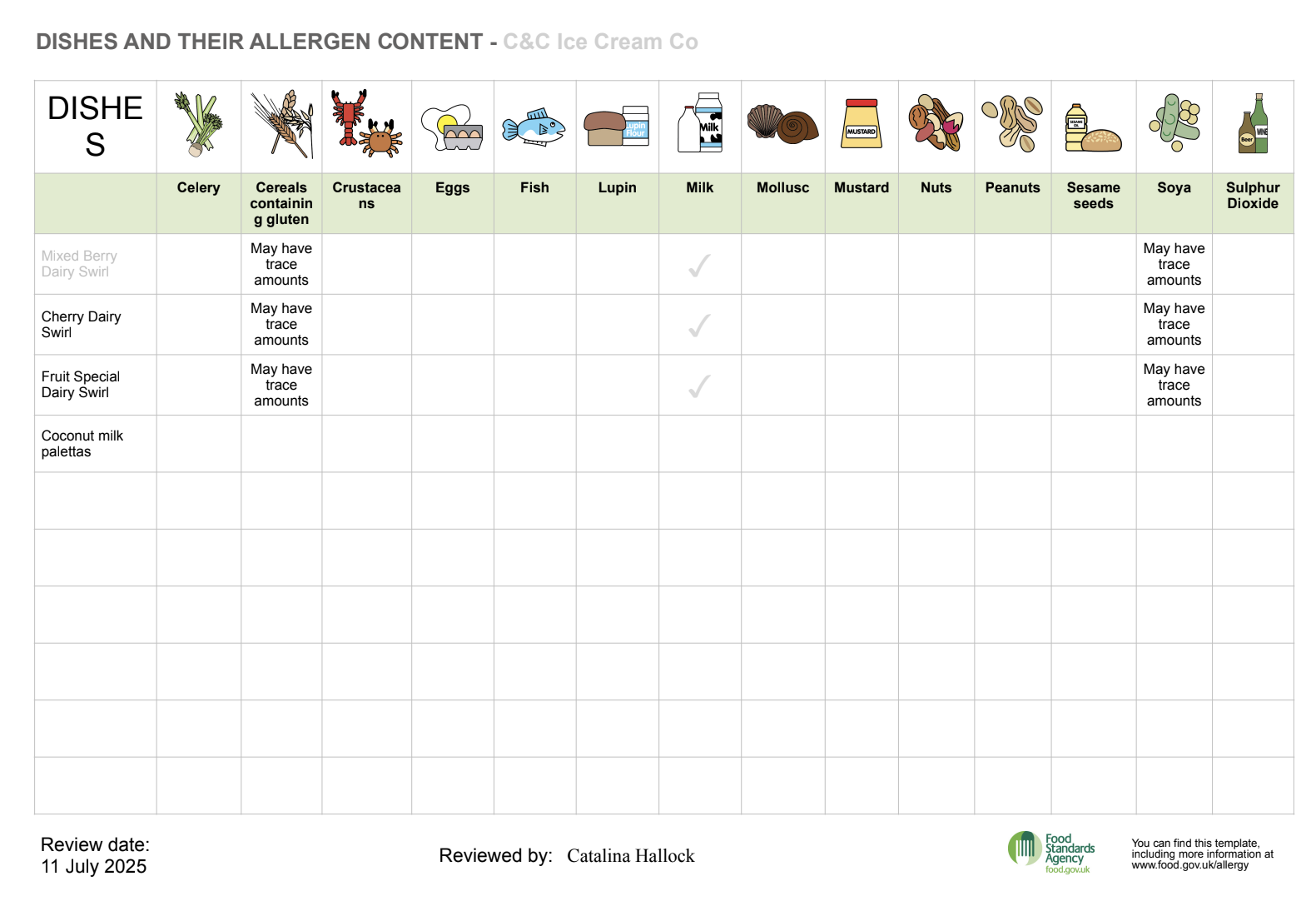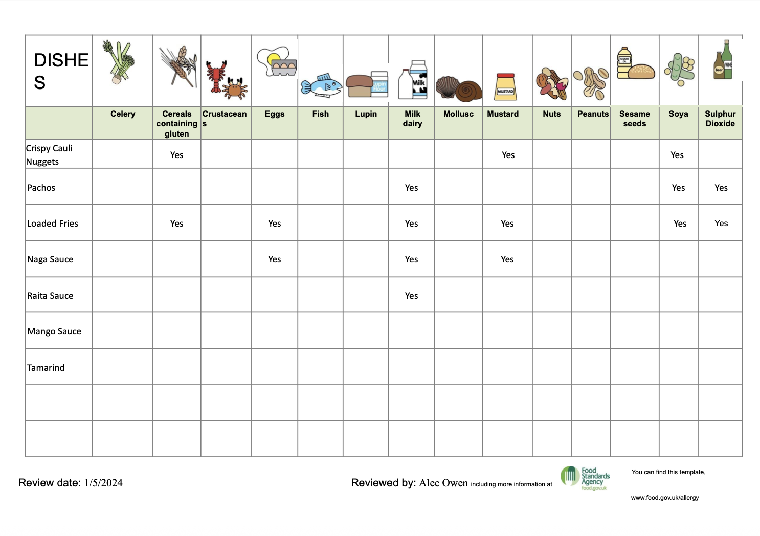 If you have a query relating any ingredients or allergens to the food served, please see below all the relevant information: