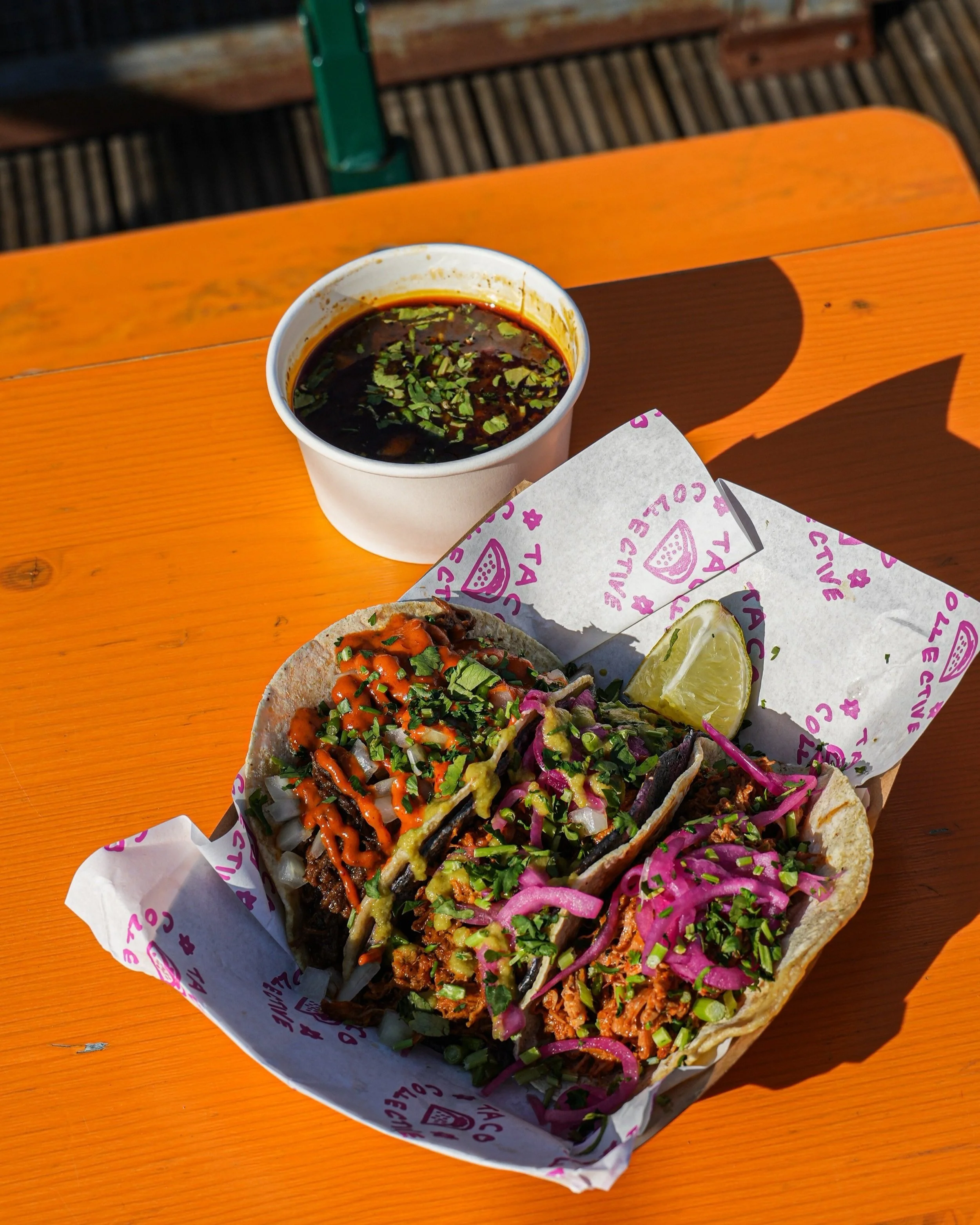 LA-style tacos loaded with various types of fillings, saucy sides + loaded fries.